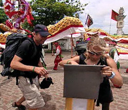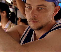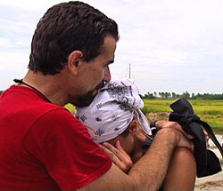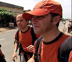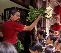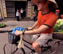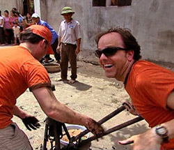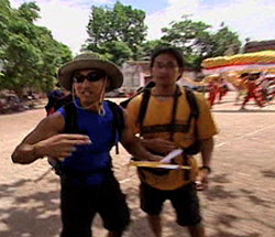 Jumping on a bike for his Team, Tom soon discovered the difficulty in balancing the flowers on it as he tries to pedal. Erwin runs into a similar situation as the locals looked on laughing. A frustrated Godwin laments, "I knew I should have done this one." Meanwhile, Peter sails through the challenge with no trouble at all. Sarah, hazarding a guess about his strong performance, remarks, "All the women love him, I think they're loving the blonde hair." Ripping open their clue, the friends learn they had to travel by public bus 30 miles to the tiny village of Vac and search for a Buddhist temple.