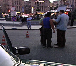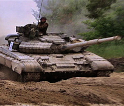 Employing a taxi to lead them, the beauty queens and models arrived at the Oster Tank School in first place to encounter a Roadblock. In this Roadblock, one team member had to navigate a Russian T-64 Tank through a 1.2-mile oval-shaped obstacle course used in simulated military exercises at the Ukraine's premiere tank training school. Once they successfully completed the course, an Officer would hand them their next clue.