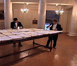 Find the Music: In Find the Music, Teams traveled 2.5 miles to The National Musical academy of Ukraine. Once here, they had to search among thousand of pieces of sheet music for the piano part to Tchaikovsky's Concert Fantasy for Piano and Orchestra. When they had the music in hand, they needed to search the conservatory's 120 practice rooms for one of six pianists waiting for sheet music. Once the pianist completed playing the piece, they would hand them their next clue. Tyler & James and Erwin & Godwin found their inner melody in this Detour.