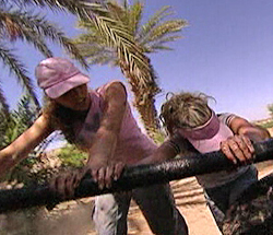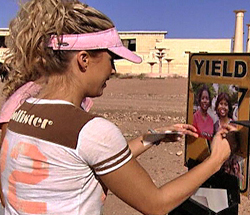 The beauty queens didn't appear very concerned while driving, but that changed when they pulled into the parking lot to see all three trucks there. An incredulous Dustin asked, "How did they all get here so fricking fast? We Yielded them and now they're ahead of us." As Dustin & Kandice waited for a workstation to open, Tyler & James battled Lyn & Karlyn for first place. As she scooped olive paste, Karlyn noted, "That's what they get. We really feel vindicated now that the Barbies are here and they have to wait." The models edged out the single moms by moments to complete the task first and rip open their clue instructing them to drive 25 miles on the road to Marrakech to the Pit Stop at a nomadic Berber camp. Right on the models' tail, an ecstatic Lyn & Karlyn drove off, exclaiming, "The Yield must have been good luck for us and it sucks for the Barbies. Karma is a B. Their evilness has finally bitten them back."