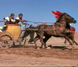 As Dustin, Rob, and James all took to the chariots dressed in traditional Roman attire, James quickly fell behind the other Teams when he horses got spooked and ran off of the track. Dustin took an early lead, later commenting, "I felt like a legitimate gladiator. The crowds were screaming and I was victorious in battle." After grabbing her two flags, with Rob close behind, Dustin rode her chariot past Lyn & Karlyn who still waited on the Yield mat. A fuming Karlyn took the opportunity to flip Dustin off before being chastised by her partner for being "ugly."