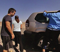 STRANDED AGAIN On the way to Idelssan, Dustin & Kandice noticed that Rob & Kimberly's tire was flat, but chose not to tell them until a few minutes later as Kandice joked, "We're not evil blondes. We're just competitive blondes." Faced with another car breakdown, the dating couple couldn't find a jack to fix their tire. Meanwhile, having breezed through the Roadblock with nobody else there, Lyn & Karlyn passed by the stranded dating couple as Karlyn quipped, "If you have trouble every time you get in a car, then maybe it's you, not the car."