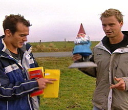 ROADBLOCK In this Roadblock, one Team member had to search a large field filled with 150 hats and feet of the Travelocity Roaming Gnome. Underneath 11 of the hats and feet would be a gnome itself that held the next clue. Jeremy, Lake, BJ, Barry, Ray, Joseph, Dave, Dani and Desiree went in search of the gnome.