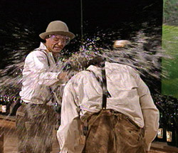 HIT PARADE Still leading the pack, friends Eric & Jeremy arrived at the studio lot of Bavaria Film to find a Detour. In this Detour, Teams had to choose between Break It and Slap It. In Break It, Team members took turns breaking stunt bottles on each other’s heads until they found one with “prost,” the German word for cheers, written on back of the label. However, they could only smash one bottle per cuckoo from a traditional German cuckoo clock. In Slap It, Teams had to learn and correctly perform a sequence of steps from a complex German folk dance. The task would be physical, but Teams with the right rhythm could finish fast.