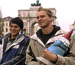 GNOME MAN’S LAND Spotting the Route Marker in the countryside near Bad Tolz, friends Eric & Jeremy opened their clue to find a Roadblock. In this Roadblock, one Team member had to search the large field filled with 150 hats and feet of the Travelocity Roaming Gnome. Underneath 11 of the hats and feet would be a gnome itself that held its next clue. Jeremy jogged out in the beautiful, green field overturning large red hats and back boots until he found one the hidden gnomes. Opening their clue, the friends learned they had to drive to Bavaria Film in Grunwald and take their gnome with them safely to the Pit Stop. After Eric & Jeremy left the field, best friends BJ & Tyler and married parents Lake & Michelle, with the help of an inebriated local, arrived the same time to quickly find their gnome as well.