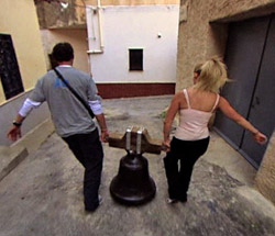 Foundry: In Italy, Teams had to walk to a nearby metal works and pick up a 110-pound church bell. Then, using a vehicle known as an Ape, they had to drive the bell to a church, Chiesa Maria, and hand deliver it up a set of steps. Joseph & Monica and Ray & Yolanda opted to put their muscles to work.