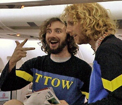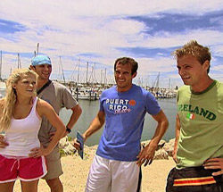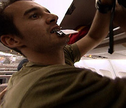 As the four Teams placed their bags in the overhead compartments on the plane, BJ & Tyler pulled into the airport. With Eric & Jeremy and Joseph & Monica believing, or at least hoping, the hippies wouldn’t be on their plane, BJ & Tyler, after a few moments of concern, secured tickets on the boarding flight. Reminiscent of Rob & Amber’s surprise entrance several seasons ago, BJ & Tyler eagerly walked to the plane anticipating the looks of shock they planned to see, saying, “Time to rub it in their faces.” While Fran & Barry appeared happy to see BJ & Tyler, Monica whispered to Joseph, “How annoying.” Ray added, “Everybody looks like they saw a ghost when they saw the hippies.” A disappointed Joseph remarked, “Those lucky bastards.”