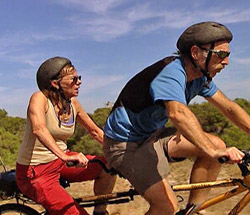 BICYCLE BUILT FOR TWO The next morning the five Teams boarded a ferry taking them 13 miles to Rottnest Island. After arriving on the island, the Teams each chose a tandem bike and began a three-mile trek along the winding roads that would take them to a lighthouse and their next clue. As expected, the athletic Eric & Jeremy took an early lead as everyone struggled somewhat as they faced the challenge of biking up and down the many hills of the island. Arriving at the Route Marker, Eric & Jeremy opened the clue to find a Detour. In this Detour, Teams had to choose between Sand and Sea. In Sand, Teams would choose a pile of 40 large branches and drag them 126 yards to a marked sand dune. This task, known as “brushing the beach” is commonly done in Australia to prevent beach erosion. In Sea, Teams had to dive beneath the waves and search through 50 crayfish traps lying on the ocean floor. Only a few traps contained live crayfish. After Teams returned two live crayfish, they would receive their next clue. In both cases, Teams needed to first ride their tandem bikes to the Detour.