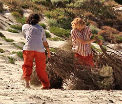 Sand: After riding tandem bikes to the Detour on Rottnest Island in Australia, Teams needed to choose a pile of 40 large branches and drag them 126 yards to a marked sand dune. This task, known as “brushing the beach” is commonly done in Australia to prevent beach erosion. BJ & Tyler, Fran & Barry and Ray & Yolanda brushed the beach.