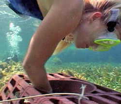 Sea: In Sea, Teams also needed to take a ride on a bicycle built for two before diving beneath the waves to search through 50 crayfish traps lying on the ocean floor. Only a few traps contained live crayfish. After Teams returned with two live crayfish, they would receive their next clue. Eric & Jeremy and Joseph & Monica took a dip in the ocean.