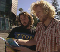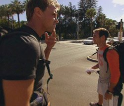 Choosing to stay dry, dating couple Ray & Yolanda arrived at the Lost City and searched for their Aboriginal. After listening for the sound of music, the pair located him and sat down to play their didgeridoo. While the pair initially had problems playing a note, after a few attempts each made the proper buzzing sound with their lips to produce some music. Their next clue instructed them to drive through the Australian outback to the Pit Stop at Lake Bennett. On their way out of the Lost City, they crossed paths with Joseph & Monica who just pulled in to begin the Detour.