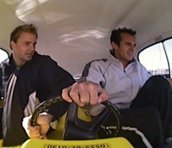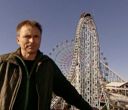 Pulling into the amusement park together, Eric & Jeremy and BJ & Tyler opened their next clue to find a Roadblock. In this Roadblock, one Team member had to experience the adrenaline rush of three consecutive thrill rides: The Pizza, Denbo and Fujiyama. While coping with the rides, they also had to maintain enough composure to spot a man holding a sign with a message somewhere along the way on one of the rides. Once they completed the three rides, they would tell a park manager what message they saw to earn their next clue.