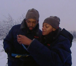GONE FISHIN' Landing in a very snowy Anchorage, the three Teams opened clues on their vehicles instructing them to drive 30 miles to the scenic recreation area Mirror Lake. As the sun rose across the beautiful, frozen landscape, the Race heated up between the Hippies and the Frat Boys while Ray & Yolanda's navigational woes kept them squarely in last place. Pulling into Mirror Lake together, BJ & Tyler and Eric & Jeremy encountered their final Detour having to choose between Drill It and Deliver It. In Drill It, Teams needed to use an auger to drill ten holes in Mirror Lake and then push a shack across the lake to cover at least two of the holes in order to set up an ice fishing camp. In Deliver It, Teams had to load a bush plane with medical supplies and, using a map to navigate, direct their pilot to an airfield to deliver the supplies to a first aid station.