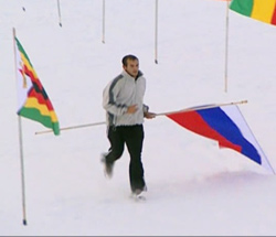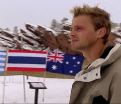 With a million dollars on the line, Eric ran into the field, quickly grabbing flags for Brazil and Japan. Within minutes, the Race ended as it began when BJ & Tyler arrived at Red Rocks for a final showdown with the rival Frat Boys. As BJ began grabbing flags, Eric made his first critical mistake when he switched the order of Germany and Russia. While Eric continued to show signs of stress, BJ, with Tyler cheering him on, began collecting his nine flags at a faster pace, although nearly all were out of order. After collecting all of the flags, Eric had four incorrect, but did not know how to fix them. After another pass, he fared worse, now having six incorrect. Meanwhile, BJ snagged the Russian flag and started placing his flags in proper order as Eric had two incorrect. With Eric still trying to fix his mistake, BJ placed the final flag in order and the best friends received an okay from the judge to continue on to the finish line.