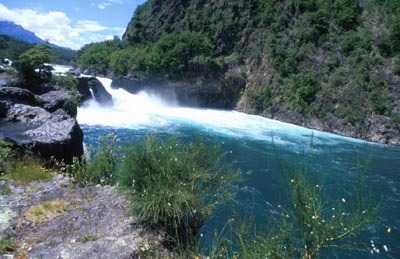 Petrohue (pronounced petro-way) is a tiny lovely town located in front of the Lago Todos los Santos and at the base of the Orsono volcano, 64 km from Puerto Varas, and 84 km from Puerto Montt, in the Chilean Lake District. Petro is the name given to the giant blood sucking mosquitoes of the area, and 'hue' means place. The journey from Puerto Montt to Petrohue is a car ride of a little over an hour. The road skirts by numerous little farms, goes through Puerto Varas, a very touristy town, and along the shores of Lago Llanquihue, going finally along the Petrohue river, with the views of Orsono (2661m), Puntiagudo (2490m) and Tronador (3460m) volcanoes ever present. There is only one hosteria there. It's a quaint 3-story building with stand-out windows on each guest room, with flowers in front of them, which make the entire hosteria look like a Swiss chalet. At Petrohue, one can hike the 6 Km to the beautiful Saltos (waterfalls) and behind the hosteria there are several trails that lead up to the top of Orsono.