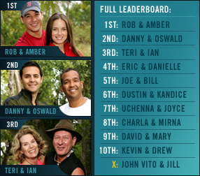 Arriving at Pim's Restaurant, newlyweds Rob & Amber snagged one of the 7:00am departures along with former dating couple John Vito & Jill, cousins Charla & Mirna, and best friends Danny & Oswald. Celebrating another early lead, Rob kissed Amber, saying, "Baby, you did good today. See? We haven't lost it. It's been two years, but we still got it."